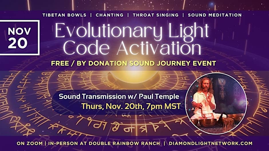 FREE ON ZOOM (Donations welcome) Live attendance is available at Double Rainbow Ranch in Boulder, CO. Please arrive 15 minutes prior to start to get settled. Contact Paul for more info: DiamondLightNetwork@gmail.com.