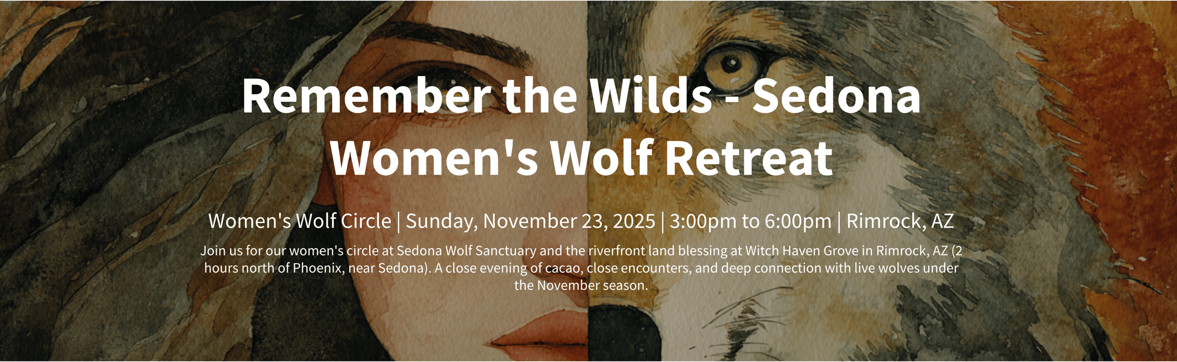 This November, under the setting sun and rising moon, we gather in Sedona to reconnect with the wild and remember what it means to be fully alive. Across two sacred lands the Sedona Wolf Sanctuary and Witch Haven Grove on the banks of Beaver Creek we’ll share an intimate evening of deep connection and embodied presence.
